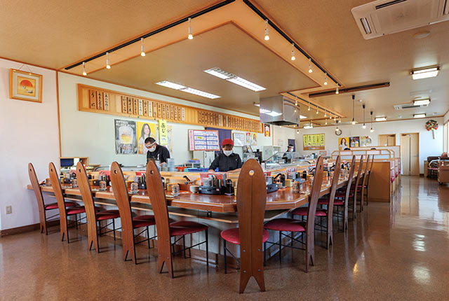 岩船漁港や寝屋漁港などの近隣でとれた新鮮な魚介類をはじめ、全国から届く旬の魚を職人の技で丁寧に握った寿司が食べられる人気店。